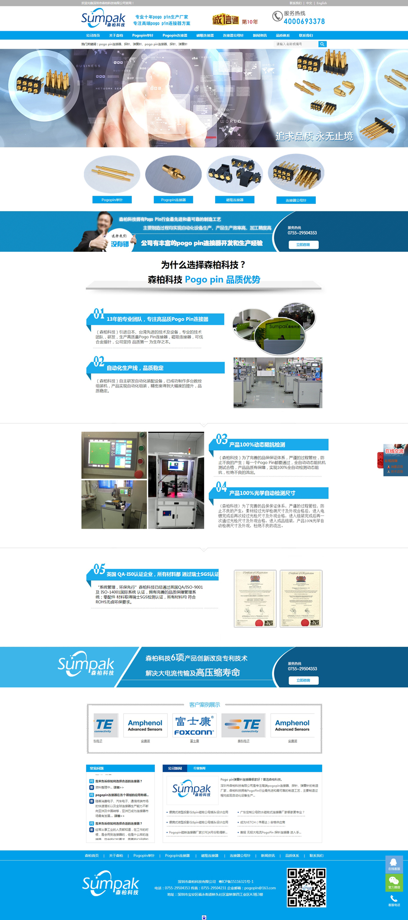 Project Description 深圳市森柏科技有限公司是专注高端pogo pin连接器、探针、弹簧针的制造厂家,森柏科技拥有Pogo Pin行业最先进和最可靠的制造工艺,主要制造过程均实现自动化设备生产,产品生产效率高,加工精度高,重要检测过程均采用自动化快速识别系统,大大降低了人为操作失误的风险,极大的提升了检测效率,工艺过程得到极大的改善和满足。因此产品质量和稳定性获得巨大突破。 Official website address 临沧http://www.zgsumpak.com I want to share